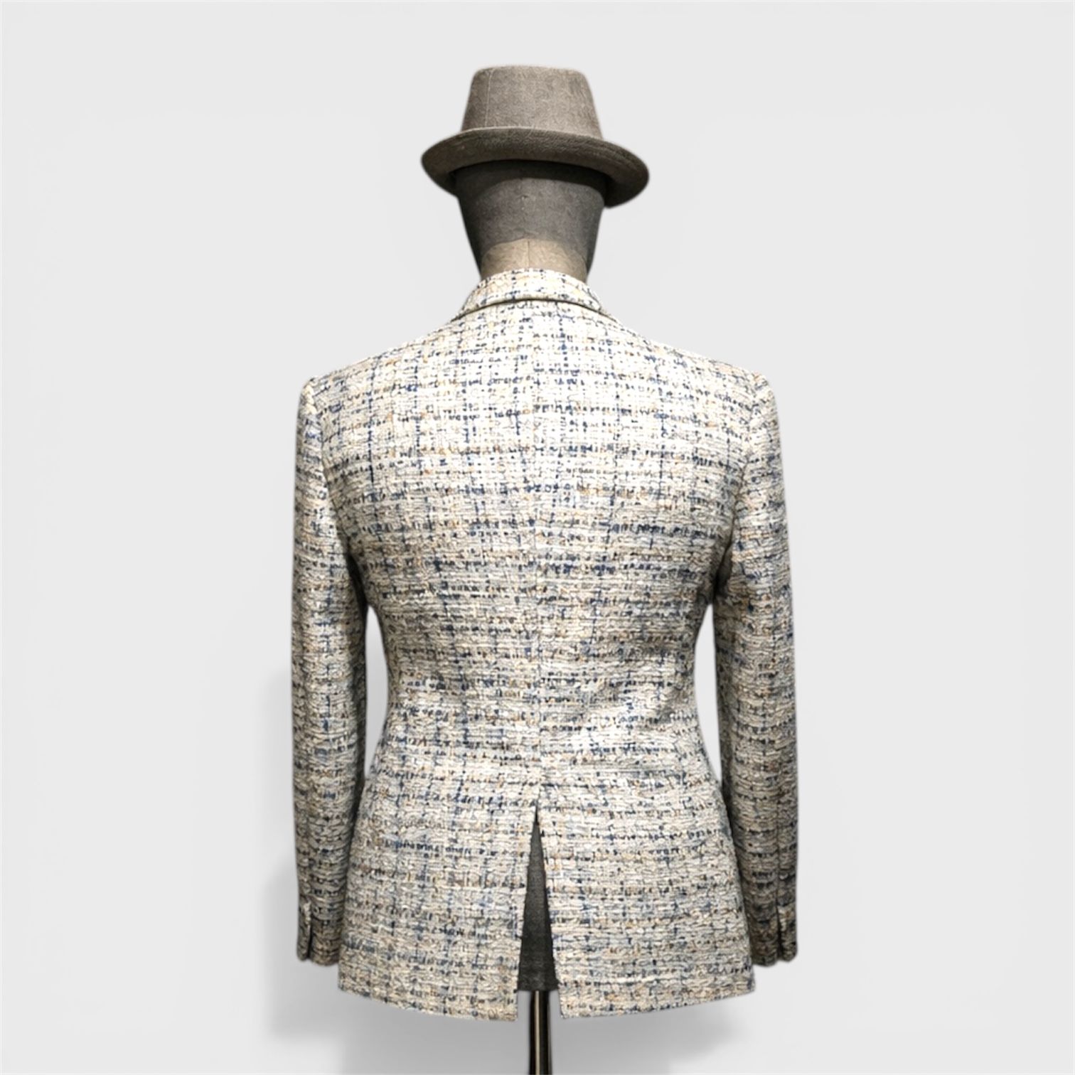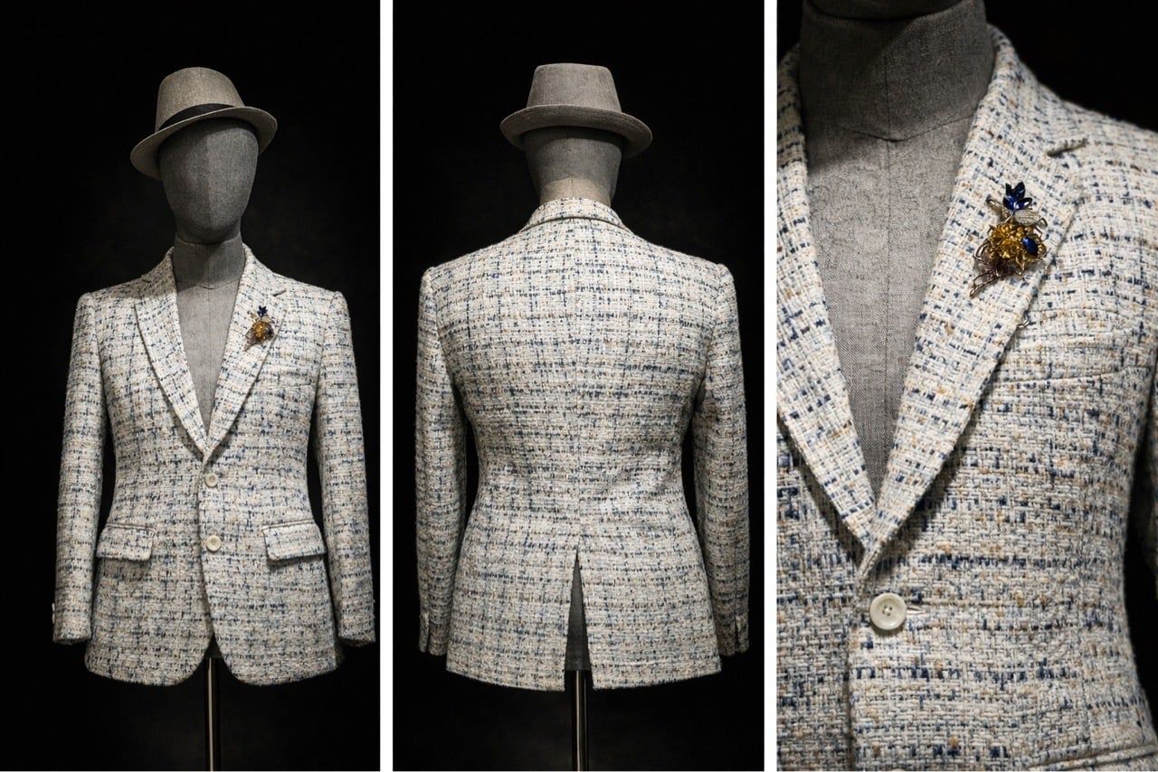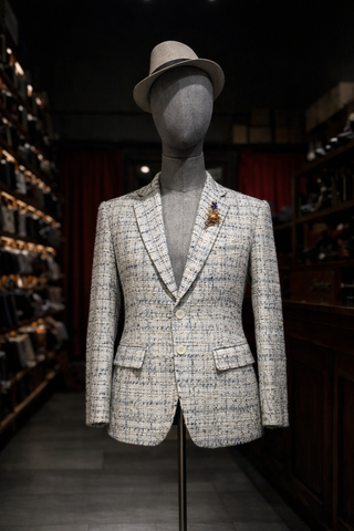 Áo blazer nam may sẵn từ vải tweed dệt nhiều sợi, nền kem sáng xen các sợi xanh navy và be, tạo bề mặt vải có chiều sâu đặc trưng của tweed. Tổng thể màu sắc nhẹ, dễ phối trong nhiều hoàn cảnh.