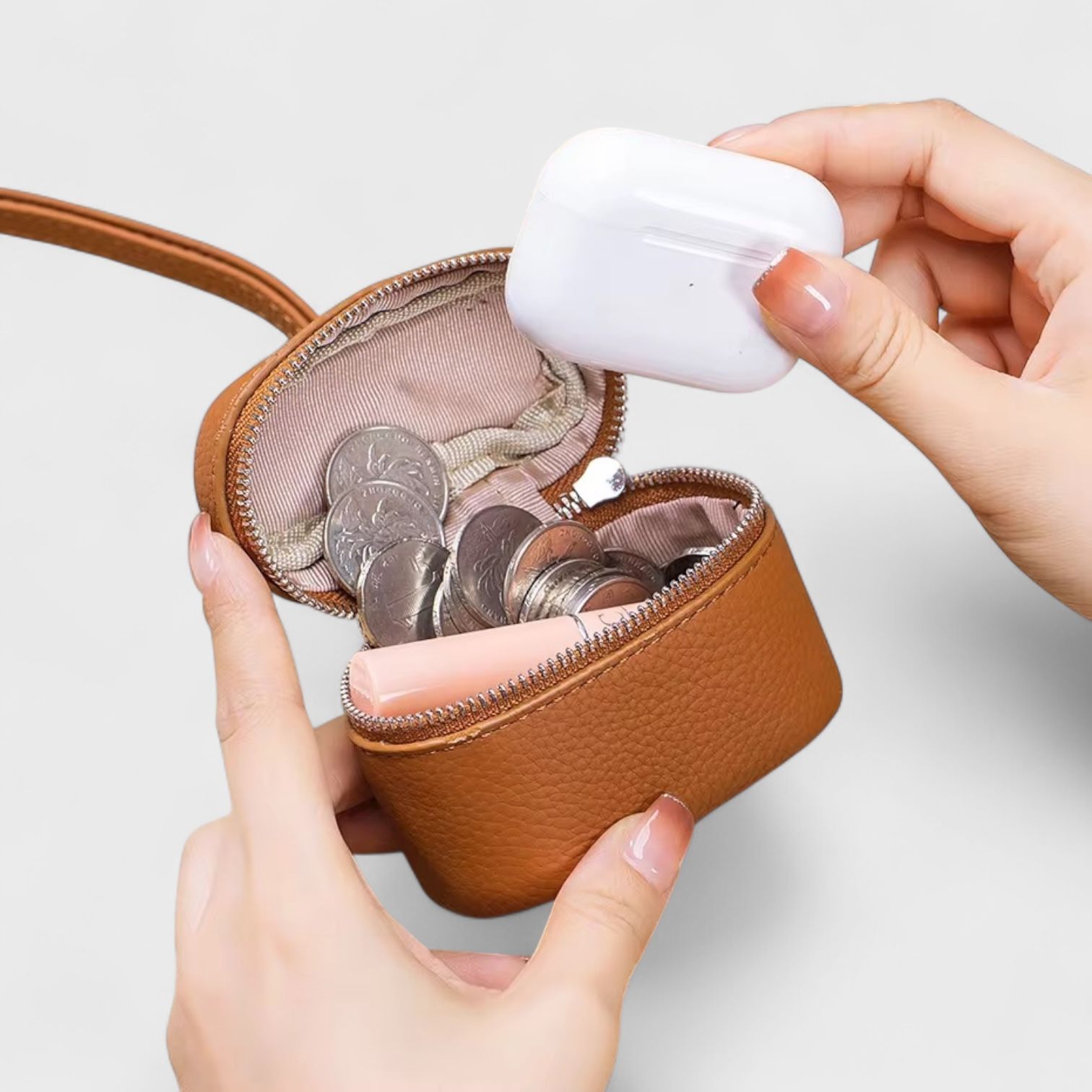 - Ngăn chứa: 1 ngăn chính – để tiền xu, tai nghe, chìa khóa hoặc những món đồ nhỏ xinh